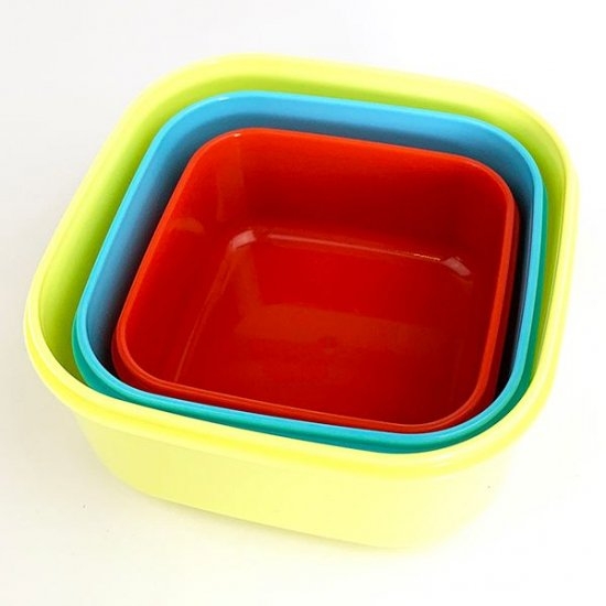 ベーシックな正方形のシール容器も、ご紹介します。赤・青・黄の原色3色がセットになっていて、それぞれにデザインも違います。