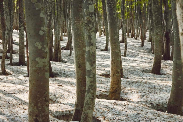 本州最北端に位置する青森県では、5月頃に木々が芽吹き、春を迎えます。その頃の森で見られるのが、幹の周りの雪が丸く溶ける現象「根びらき」です。これは、太陽の熱で温められた幹が、その周りの雪を溶かすために起こります。北国の人々は、根びらきを農作業を始める目安にし、春の訪れを告げるものとして親しんできました。当ホテルから車で20分ほどの場所に広がるブナ林では、根びらきと新緑が同時に見られます。約1ヵ月間しか見られないこの景色を間近で見ていただきたく、当アクティビティを考案しました。