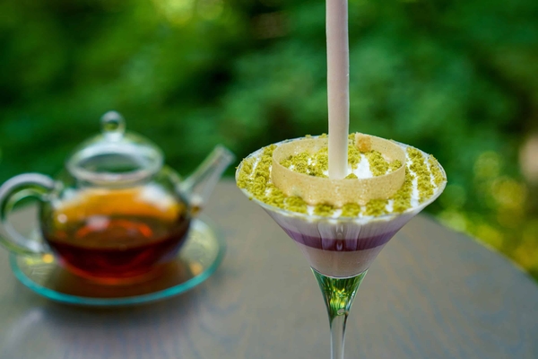 散策後には、根びらきをイメージしたオリジナルスイーツを館内で楽しめます。グラスの底から、レモンと柚子のシャーベット、苺と紅茶のジュレ、生クリームと3層になっている爽やかなスイーツです。仕上げに抹茶パウダーで芽吹きを、メレンゲスティックとパートブリック(*3)で根びらきを表現しました。春らしい爽やかな甘さと合わせ、見た目も楽しめる一品です。