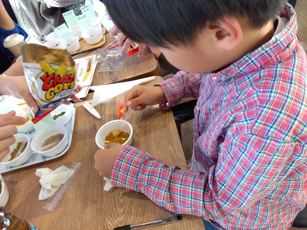 最後には、色々なスパイスを混ぜて自分オリジナルの「カレーパウダー」を作って、スナック菓子にまぶして試食を行いました。