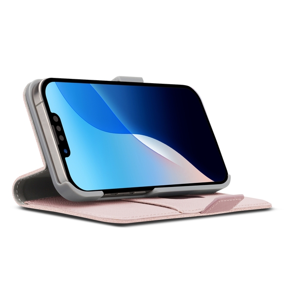 上質な手触りのスエード調のカバー(ポリエステル素材)でiPhoneの液晶画面をしっかり護ります。特許取得済みのマグネットロックで、ラクラクカバーを開閉する事が可能。便利な横スタンド機能で動画の視聴をお楽しみ頂けます。通勤通学やお買い物に便利な2つのカードポケット・ショルダーストラップを取り付けするのに最適なストラップホール付き。カバーを付けたままワイヤレス充電が可能です。