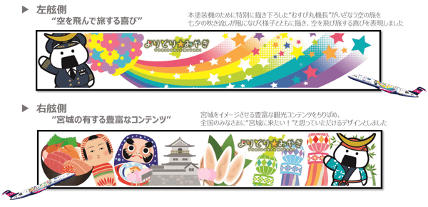 IBEX は本機の運航を通じて宮城県の魅力を就航各地へ発信するとともに、お得な航空券の販売等を通じて地域間観光流動の促進に努めてまいります。機体デザインならびに就航記念セールの詳細は以下の通りです。