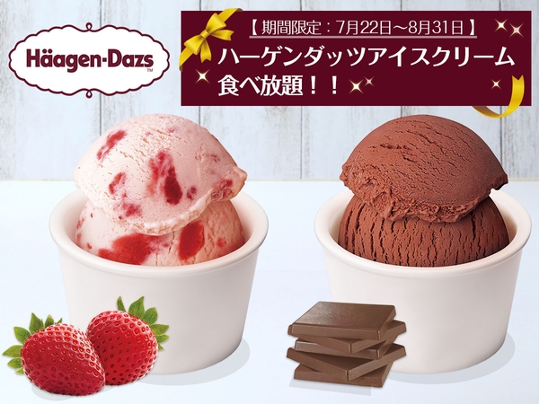今年の夏はお子様連れのファミリーにお喜びいただけるフェアをご用意いたしました。目玉はなんと言っても「ハーゲンダッツアイスクリーム」の食べ放題です。ストロベリーとスイートチョコレートの2フレーバーをバイキングスタイルでお好きなだけお楽しみいただけます。