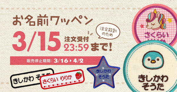 入園・入学準備にとお買い求めいただいているお名前ワッペンが、ご注文の集中で製造が追いつかなくなり、お届けまでにお時間がかかる状況となってまいりました。そのため、受注受付を一時的に締め切らせていただきます。