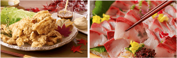 左:ライブキッチンから揚げたてをご提供する大分名物「とり天」。甘みとコクのある南蛮ダレとタルタルソースを添えて、ご飯にもビールにもぴったりの美味しさをお楽しみください。