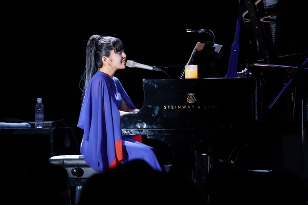 奄美大島に生息するルリカケスをイメージしたという青と赤の衣装に身を包み、オリジナル楽曲のみならず、昨年12月に公開された映画『かがみの孤城』のメインテーマ「かがみの孤城」や、カバー曲「桜坂」(福山雅治)、「瞳を閉じて」(荒井由実)も披露した。