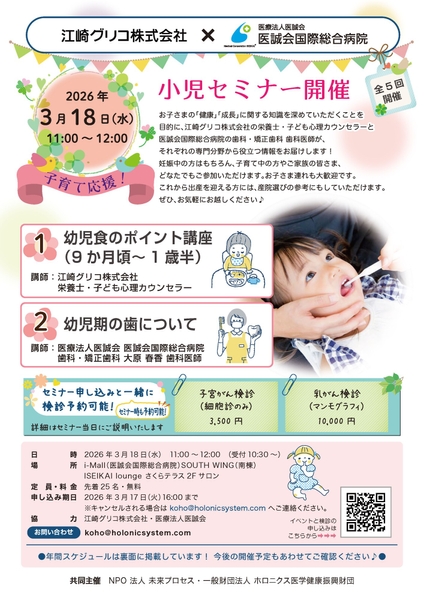 医療法人医誠会(本社:大阪府大阪市、代表者:谷 幸治)は、2026年3月18日(水)、医療複合施設i-Mall内のISEIKAI lounge さくらテラス2階サロンにて、江崎グリコ株式会社と共同で「第5回 江崎グリコ株式会社×医療法人医誠会 医誠会国際総合病院 小児セミナー」を開催します。本セミナーでは、子育て期に知っておきたい幼児食のポイントや幼児期の歯の基礎知識について、江崎グリコ株式会社の栄養士・子ども心理カウンセラーと、医誠会国際総合病院 歯科・矯正歯科の歯科医師が、それぞれの専門分野から解説します。