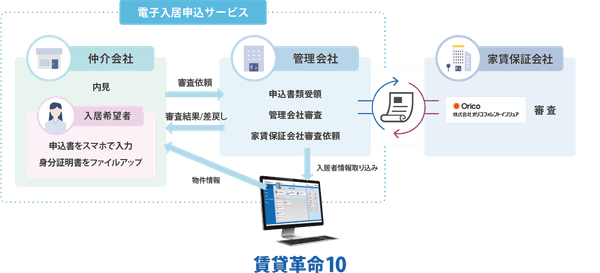電子入居申込は、弊社が運用する業者間物件流通サービスと合わせてご利用いただく管理会社向けのサービスです。電子入居申込サービスを導入することで、入居申込のやり取りのほとんどをオンラインで完結させることができます。仲介会社とのやり取り等の業務負担を改善することができ、テレワークにも最適です。また、弊社が提供しているクラウド型の賃貸物件総合管理システム「賃貸革命10」と一緒にご利用いただくと、物件情報や入居者情報が連動しますので、不動産業務を更に便利に一貫して行うことができます。