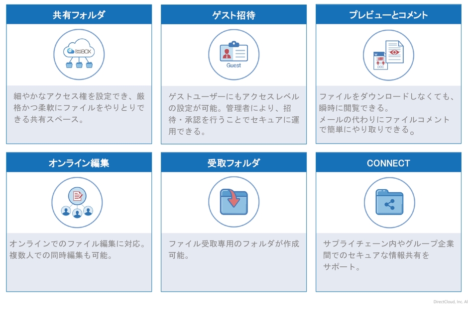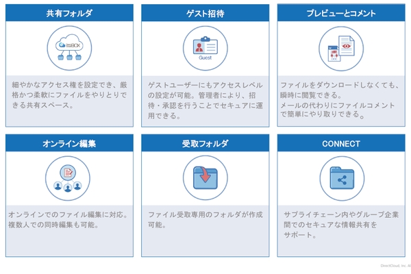 当社は、紙文書を電子化する「文書電子化」サービスの提供を行っています。紙文書の電子化により物理的な制約がなくなることで、テレワークなどの“働き方改革の推進”をはじめ、劣化・紛失に備える“BCP対策”、オフィスの“スペースコスト削減”、そして、資料を探す手間を無くすことによる “業務効率化”といった紙文書にまつわる企業が抱える課題を解決しています。 しかし、これらの課題解決を最大化するために、電子化されたデータを顧客がファイルサーバーなどに保管・管理を行う必要があり、これらに工数がかかるため電子化したのはよいが、その後活用されにくいという、新たな課題がありました。今回、当社が「DirectCloud-BOX」の取り扱いを開始することで、紙文書の電子化以降、データの社内共有、閲覧・検索までワンストップで提供できるようになり、シームレスに顧客は在宅時や外出先からでもアクセスが可能になります。