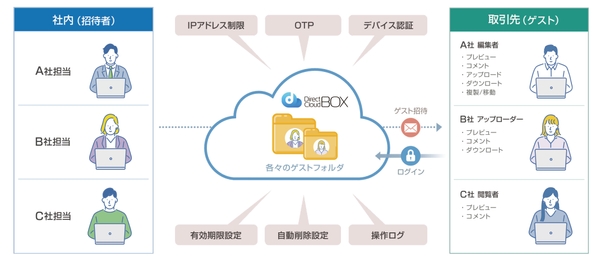 ゲスト招待による社外の取引先を招待し、セキュアな環境でのファイル共有、共同作業を実現します。