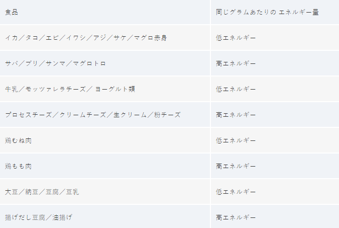 次の表の食品は高たんぱく質だといわれていますが、魚介類や肉類などの中でも、食品の種類や部位によってエネルギー量の違いがあることがわかります。