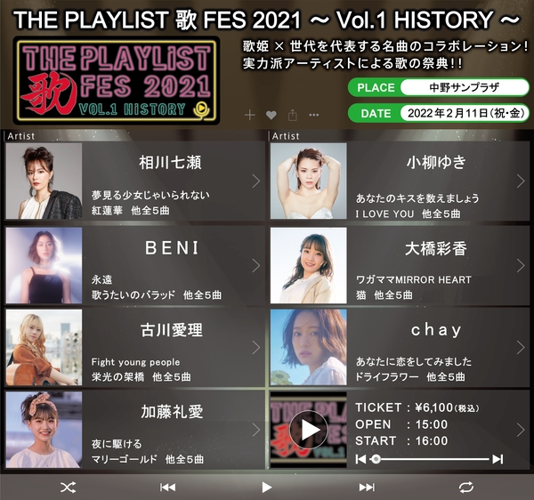 「THE PLAYLIST 歌FES 2021 ~Vol.1 HISTORY~」延期スケジュール、出演者決定! 歌姫×名曲のコラボレーション!笑顔、感動、涙する歌の祭典