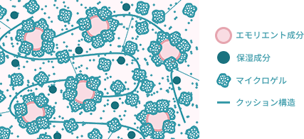 水分を保持する効果(エモリエント効果)のあるオイルが、マイクロゲルで包まれているという構造で、お肌に塗ると外側のマイクロゲルが崩れ、中のオイルが飛び出すという仕組みです。