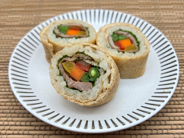 自家製の甘辛ダレで漬け焼きにした豚肉とサンチュ、赤パプリカ、黄パプリカ、ニンジン、インゲンの5種類の野菜を酢飯とともにお揚げで巻き上げました。甘さひかえめのお揚げと自家製ブレンドのすし酢を使用した酢飯が肉巻きの甘辛ダレと相性抜群!5種類の野菜とともにヘルシーに召し上がっていただけます。