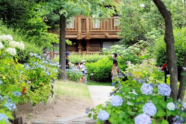 「あじさい展」は2016年から初夏に開催し、会期中の来場者数は累計15万人を超え、私たちにとってシンボル的な存在になっています。ログハウスが建ち並ぶ広いガーデン。紫陽花が咲き誇る光景は、まるでおとぎの国に舞い込んだ感覚になります。