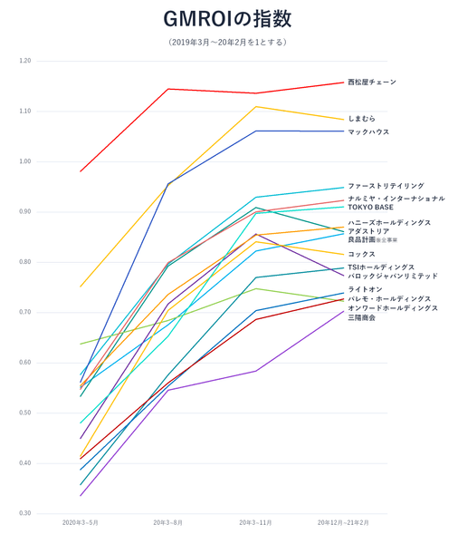 次に、GMROIの四半期(3ヵ月)ごとの推移についてみてみる。次のグラフは、2020年3~5月、20年3~8月、20年3~11月、20年3月~21年2月におけるGMROIを指数化したものだ。19年3月~20年2月を1とした指数で推移を表しており、例えば0.8であれば前年同期比20%低下、1.1なら前年同期比10%上昇を意味する。