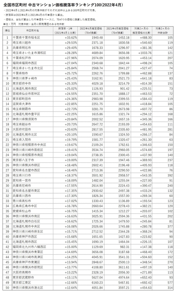 ・全国1位は「千葉県千葉市稲毛区」の+33.62%。前年と比較し、70平方メートル 換算の推定価格は約490万円上昇した。次いで「埼玉県川越市」「兵庫県明石市」で、上位11位までは騰落率が+25%を超えた。