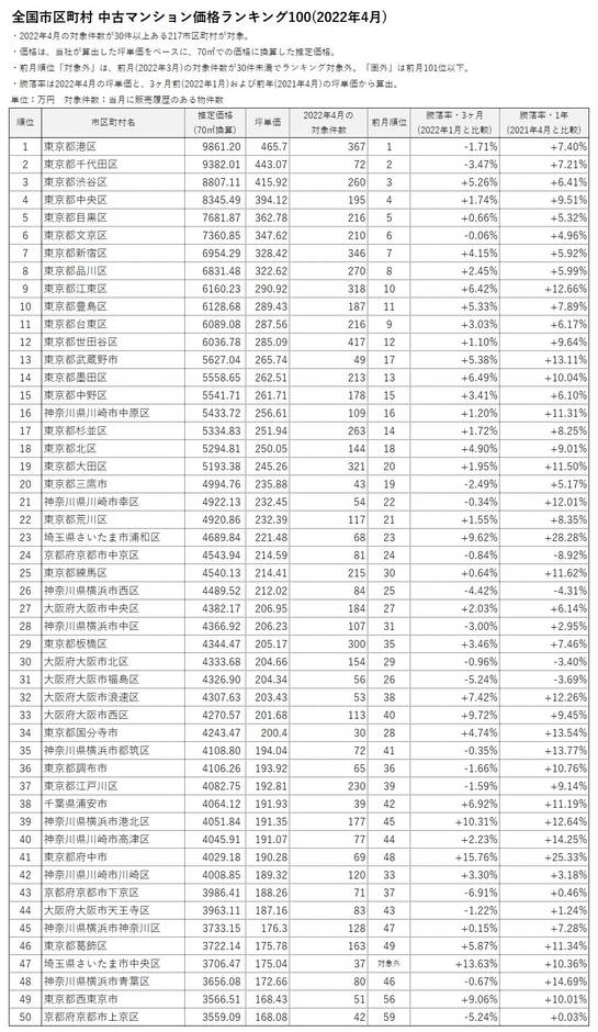 「マンションレビュー」2022年4月全国市区町村 中古マンション価格/騰落率ランキング100を発表