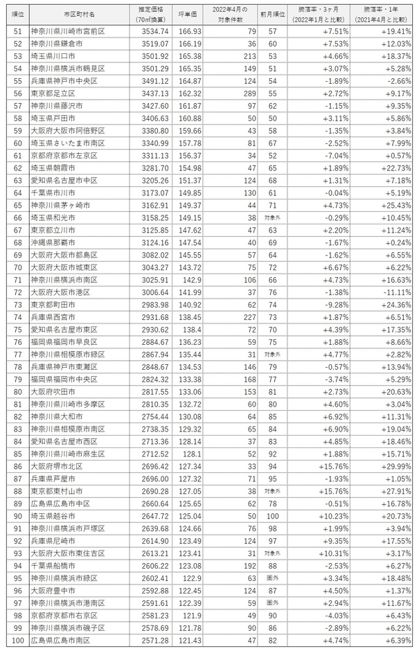 当社が保有する中古マンションの販売履歴データを元に「坪単価」を算出し、70㎡での価格に換算した「推定価格」によるランキング。2022年4月の対象件数(当月に販売履歴のある物件数)が30件以上ある全国217市区から、トップ100を掲載。
