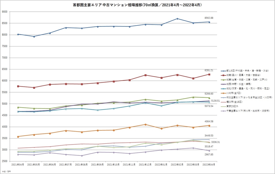 ・首都圏の主要エリアでの2022年4月の70㎡換算推定価格は、10エリア中5エリアで上昇し、5エリアで下落。