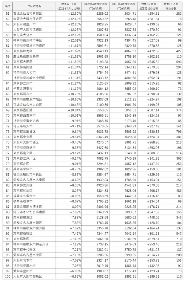 ・100位以内の市区で、前年(2021年4月)と比較して価格が上昇したのは94区。また、3ヶ月前(2022年1月)と比較して価格が上昇したのは65市区。