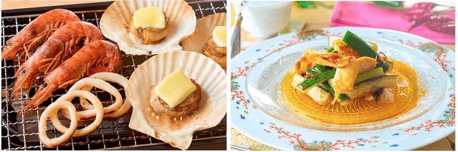 左:海老やイカ、殻付き帆立を使った「海鮮浜焼き」はライブキッチンから焼きたて熱々をご提供します。醤油やバターの香ばしい香り、ジュージューと焼ける音など、夏の浜辺で食べる気取りのない美味しさをご堪能ください。