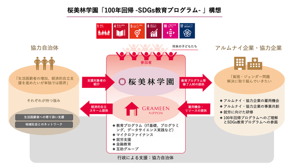 設立から100年の間、創立者・清水安三の精神「学而事人(学んで人につかえる)」を実践する桜美林学園と、ユヌス博士のソーシャル・アントレプレナー(社会起業家)精神を受け継ぐグラミン日本が、同じ志の下でパートナーシップを組み、SDGsに掲げられている「貧困をなくそう」、「質の高い教育をみんなに」、「ジェンダー平等を実現しよう」、「働きがいも経済成長も」、「人や国の不平等をなくそう」、「パートナーシップで目標を達成しよう」を達成するため推進してまいります。