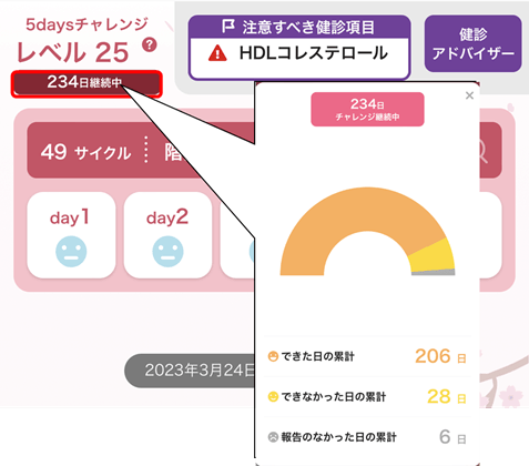 ホーム画面の左上のレベルの表示の下部に累計のチャレンジ日数を表示します。これまでチャレンジに取り組んだ日数が表示されており、クリックするとその中でできた日とできなかった日、報告を忘れてしまった日の累計日数を見ることができます。