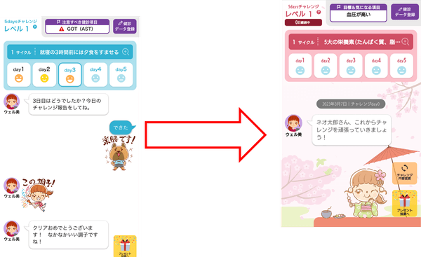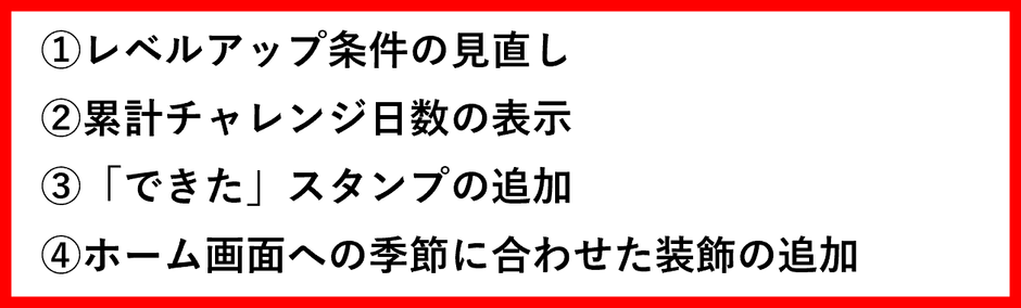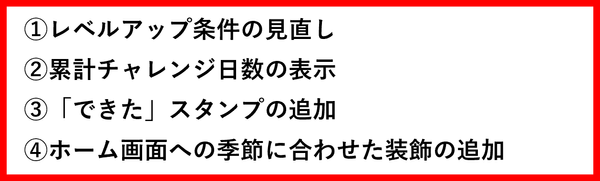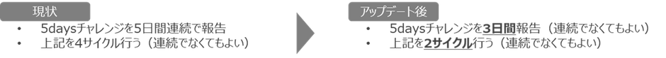 レベルアップ機能の条件を緩和しました。今までは5daysチャレンジを5日とも連続で報告し、それを4サイクル行うことでレベルアップしていましたが、今後は5日中3日報告し、それを2サイクル行うことでレベルアップする仕様に変更します。