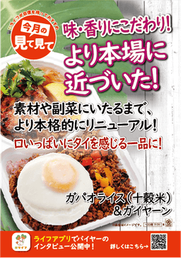 “おいしい” “ワクワク” “ハッピー” をお届けするライフコーポレーションは、タイの定番ソウルフード「ガパオライス(十穀米)&ガイヤーン」を、7月1日(金)よりさらにおいしく本格的な味わいにリニューアルいたします。