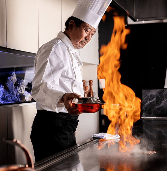 フランベの炎が上がる瞬間や、食材の香り、徐々に料理が完成していく様子などを、五感を使って愉しんでみてください。絶妙な火加減で美味しさを引き出すプロの技にも、目を奪われてしまうことでしょう。