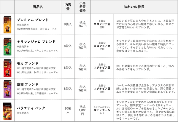 片岡物産株式会社(本社:東京都港区新橋、代表取締役社長 片岡謙治)はこの秋、一杯型ドリップ コーヒー<モンカフェ>をリニューアル。豆の選定から焙煎・抽出に至るまで一貫した品質設計で、おいしさを追求した新商品を順次発売いたします。