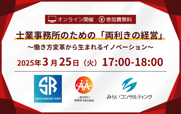 みらいコンサルティンググループ(本社:東京都中央区、代表:久保 光雄 岡田 烈司)は、2025年3月25日にセミナー『士業事務所のための「両利きの経営」~働き方変革から生まれるイノベーション~』をWEBにて開催します。