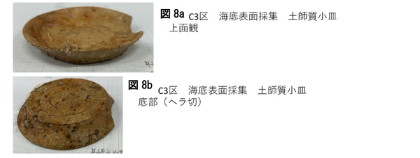 さらに付近にはやきものもみられ、海底表面に土師質小皿があり、これはサンプルとして採集しました(図8ab)。また、器種不明のやきものも海底表面にありました(図9)。この甕は採集しておらず、写真撮影を行ったのみで、今後の再調査に際して採集するか慎重に決定します。