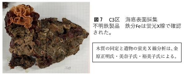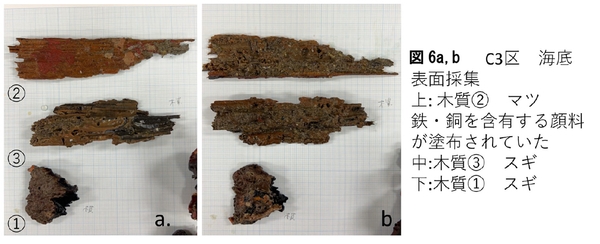船体の近くで海底表面に現れていた木質①~③、不明鉄製品1点を採集しました(図6ab,8)。
