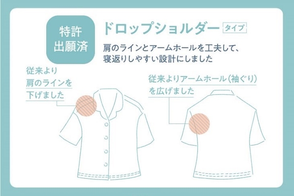 質の高い眠りに重要とされる「寝返り」に着目。科学的検証を重ねた特許出願済の寝返り設計を採用したパジャマとルームウェア。肩のラインとアームホールの設計を工夫したドロップショルダ―設計で背中・肩・腕を動かしやすくして寝返りに必要な動きの負担を軽減、寝返りしやすくしています