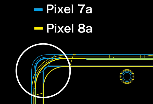 黄線がPixel 8a、青線がPixel 7aの端末の図面です。重ねて形状を比較します。