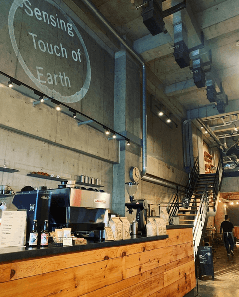 1Fはスペシャルティコーヒーを提供するカフェ「sensing-touch-of-earth(センシング・タッチ・オブ・アース)」2Fは防音室やインテリアのショールームとレンタルシアターの小さな複合施設です。