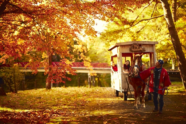 馬車で約20分かけて青森屋の敷地内にある公園を1周します。馬車の中では、赤いりんごと黄色いりんごの食べ比べができます。