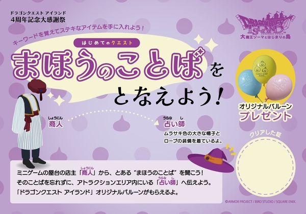 縁日エリアに出店するミニゲーム屋台の店主(商人)から、4歳以下のお子様を対象に、“まほうのことば”をお伝えします。そのことばをアトラクションエリア内の占い師に伝えていただくことで、「ドラゴンクエスト アイランド」オリジナルバルーンをプレゼントいたします
