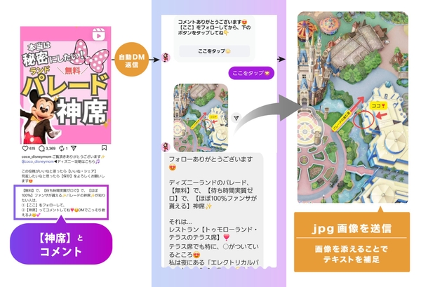ディズニー攻略情報は、文字だけでは伝わりにくい場面も多いことから、画像や動画を自動送信するメディア応答機能を活用。