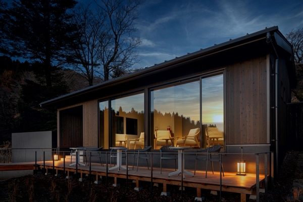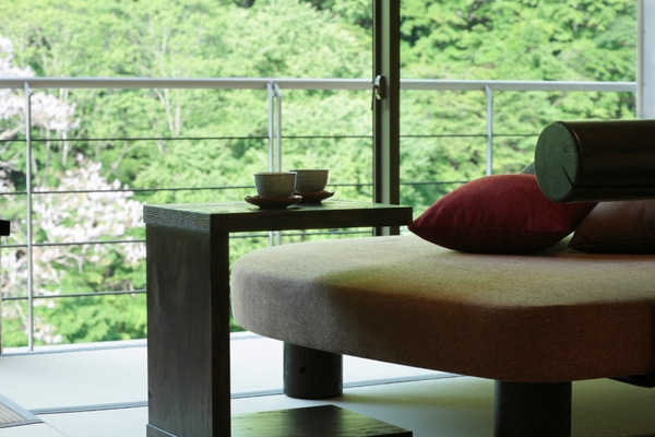 湯坂山の青葉と須雲川に全室が面している界 箱根。客室の窓際や縁台で湯涼みしながら一杯を。