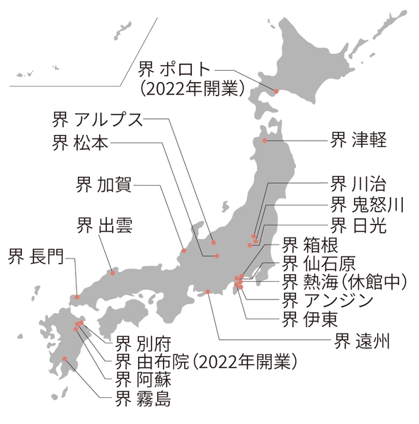 「界」は星野リゾートが全国に展開する温泉旅館ブランドです。「王道なのに、あたらしい。」をテーマに、季節の移ろいや和の趣、伝統を生かしながら現代のニーズに合わせたおもてなしを追求しています。また、その地域の伝統文化や工芸を体験する「ご当地楽」や、地域の文化に触れる客室「ご当地部屋」が特徴です。現在、全国各地に展開しており、2022年1月に19施設目となる「界 ポロト」が北海道・白老温泉に開業しました。