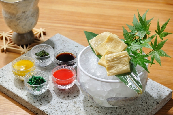 箱根の清流で作られた豆腐に、練り梅、酒盗、塩を添えて提供します。箱根寄木細工のプレートなど、工芸品にも目が奪われます。