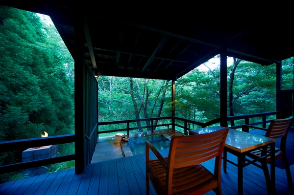 青々とした木々の緑に囲まれた客室テラス。露天風呂から上がり、そのまま脇にある椅子に腰かけ湯涼み。おこもり感のある空間です。
