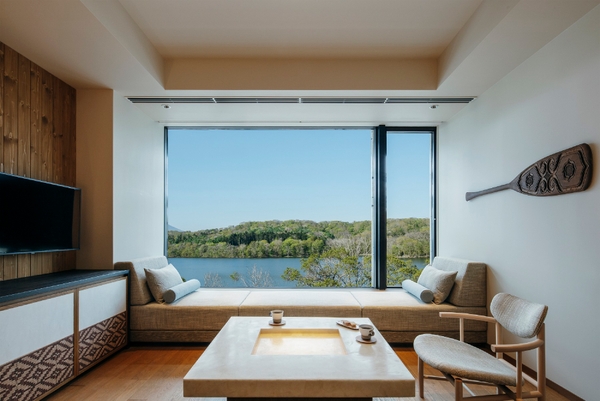 ポロト湖の景色を一望できる客室がおすすめ。アイヌ文様をイメージしたアートに目をやりながら、ビールを楽しめます。