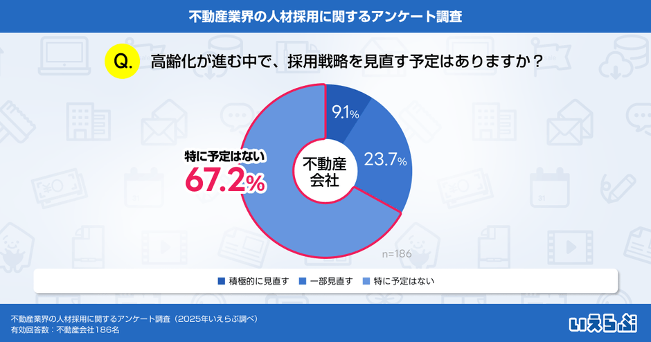 「高齢化が進む中で、採用戦略を見直す予定はありますか?」という質問では、「積極的に見直す」(9.1%)、「一部見直す」(23.7%)という回答もあった一方で、「特に予定はない」が67.2%と最も多い結果となりました。