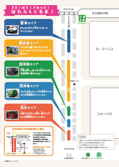 内容:府中市建設業協会・府中警察署・府中消防署・自衛隊・清掃業などによる車両展示を、けやき並木通りにて行います。お子様向けの体験コーナーも予定しています!