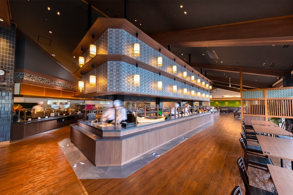 「ゆったりと、たおやかに。」お食事を楽しんでいただけるよう、各テーブルの間隔にゆとりを持たせ、今まで以上にゆったりと食事をお楽しみいただけるようにリニューアル。夕食バイキングでは、那智勝浦町の勝浦漁港で水揚げされた生まぐろのお造りや握り寿司はもちろん、まぐろ希少部位コンロ焼きやまぐろを使ったアミューズなど、ご当地の海の幸を思う存分ご堪能いただけます。また、海鮮だけでなく、熊野牛入りハンバーグ ロッシーニ風や熊野牛のピザなど、ご当地牛を使用したメニューもご用意いたします。