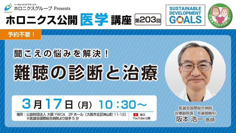 医療法人医誠会(大阪府大阪市 代表者:谷 幸治)では、第203回ホロニクス公開医学講座 『聞こえの悩みを解決!難聴の診断と治療』を、2025年3月17日(月)に公益財団法人 大阪YWCA (大阪市北区神山町11-12)で開催いたします。